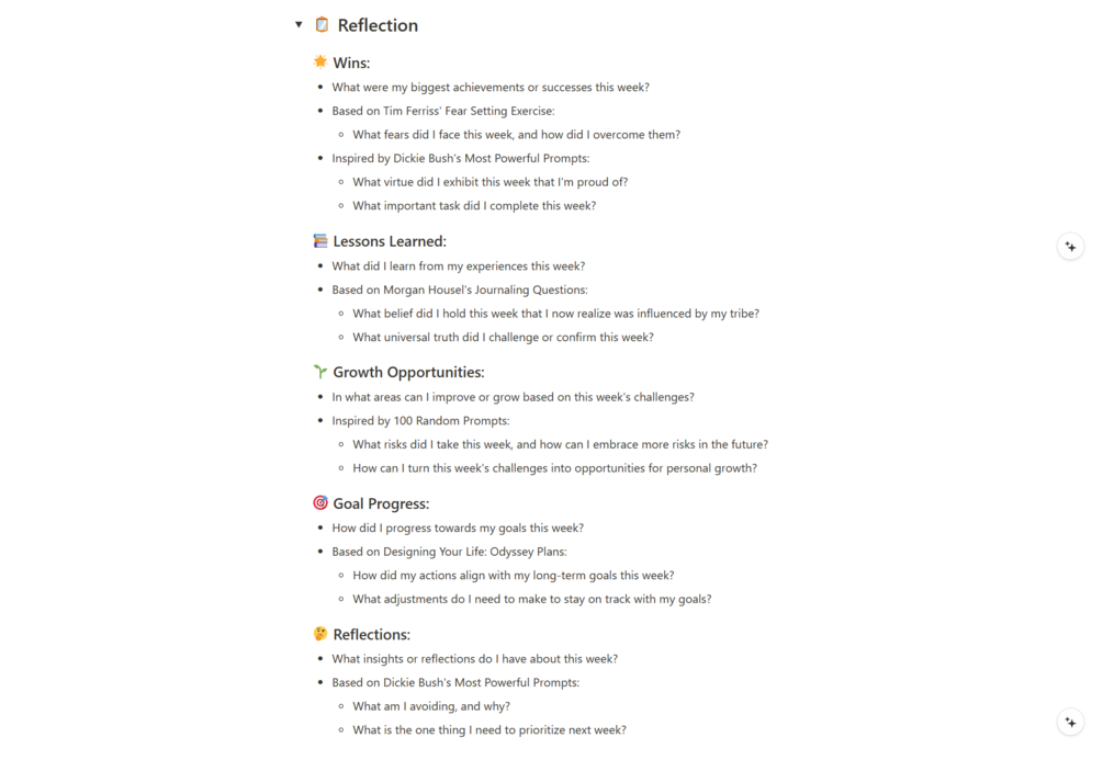 • āœļø Planning: Strategize for the week ahead by identifying key objectives, prioritizing tasks, scheduling for success, setting up challenges, anticipating obstacles, and visualizing success.